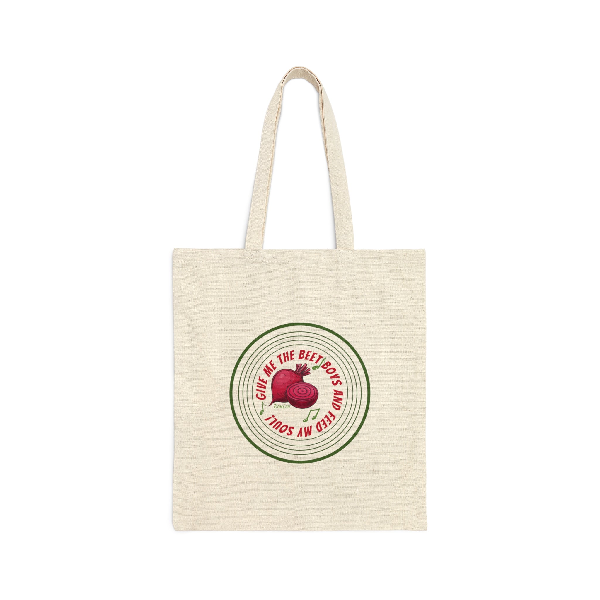 Give Me The Beet Boys and Feed My Soul Cotton Canvas Tote Bag This 100% cotton bag comes in one size – 15" x 16"– perfect for everyday wear. While the canvas material will show off your designs in great colors, it's durable and will last for years. The bag features 20" handles (made from the same canvas), making it easy to carry even with a week's worth of shopping.