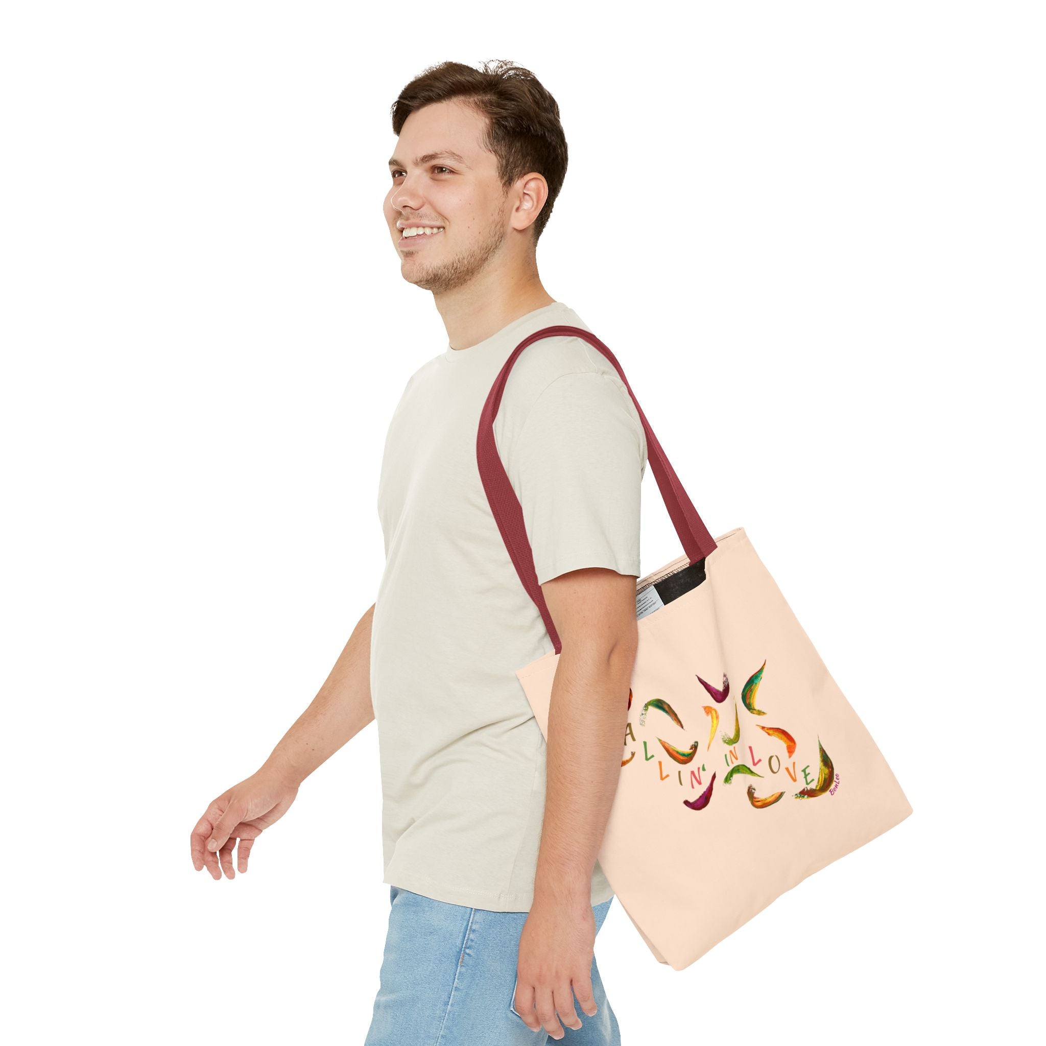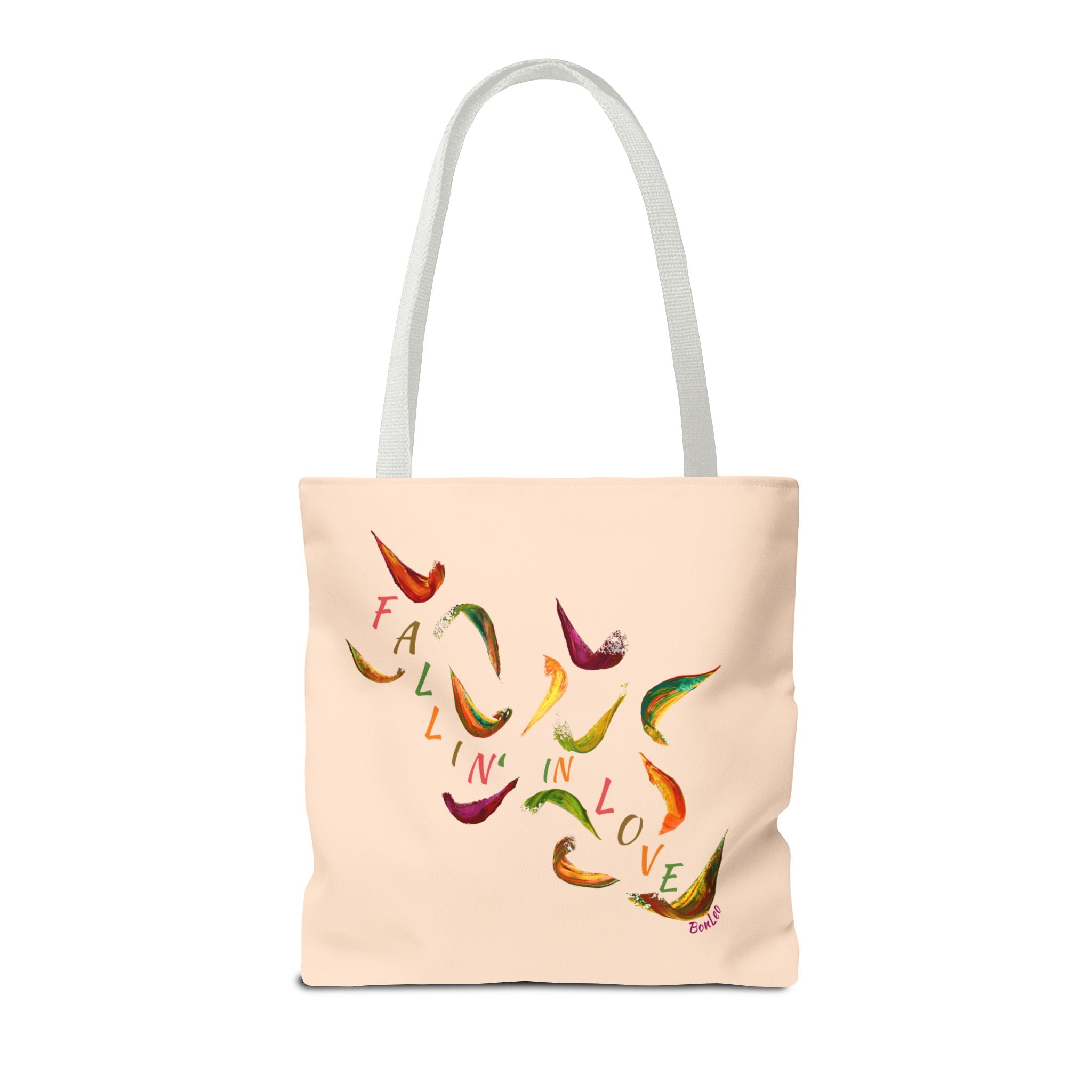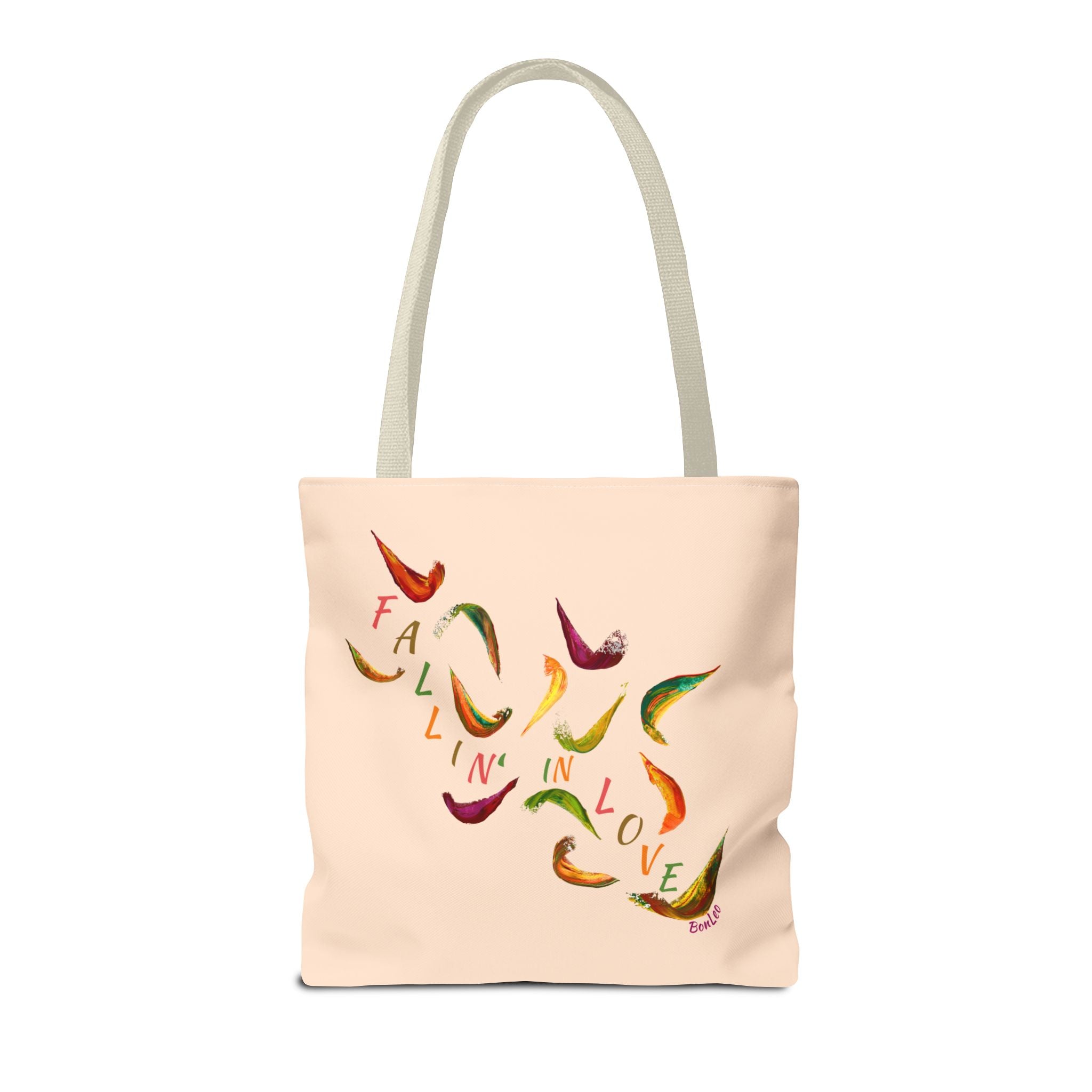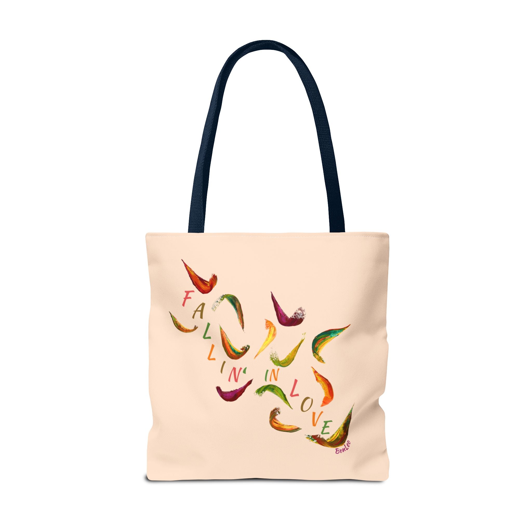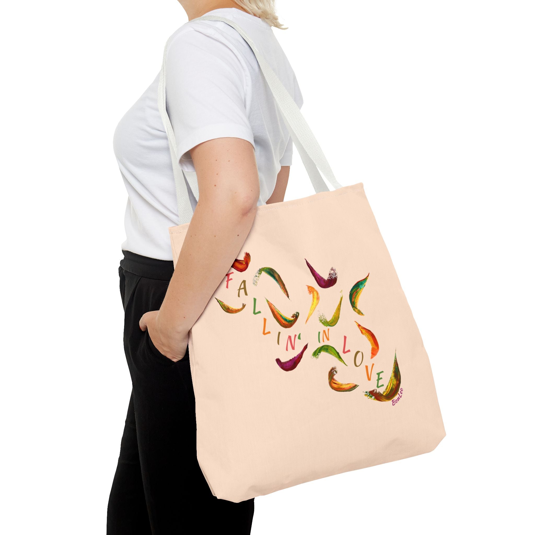 Fallin' In Love Painted Leaves Tote Bag. This one of a kind tote has beautiful Fall leaves painted my Lenny Pinna. Colors include red, orange, brown, gold and green. Celebrate Fall in style!