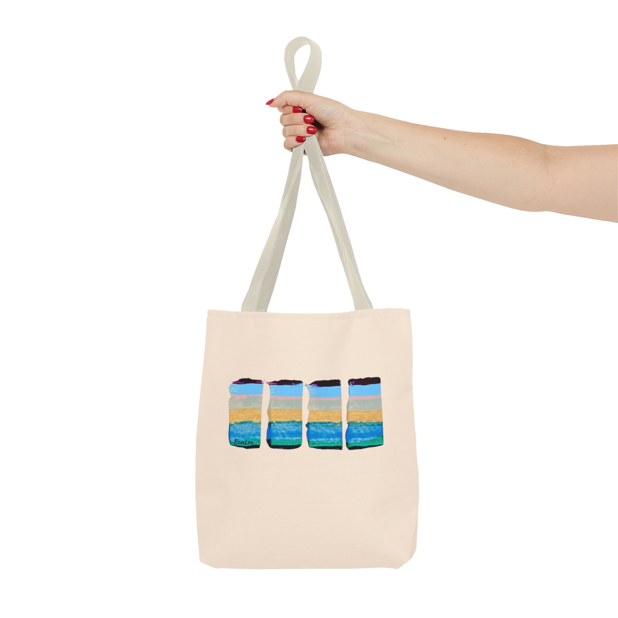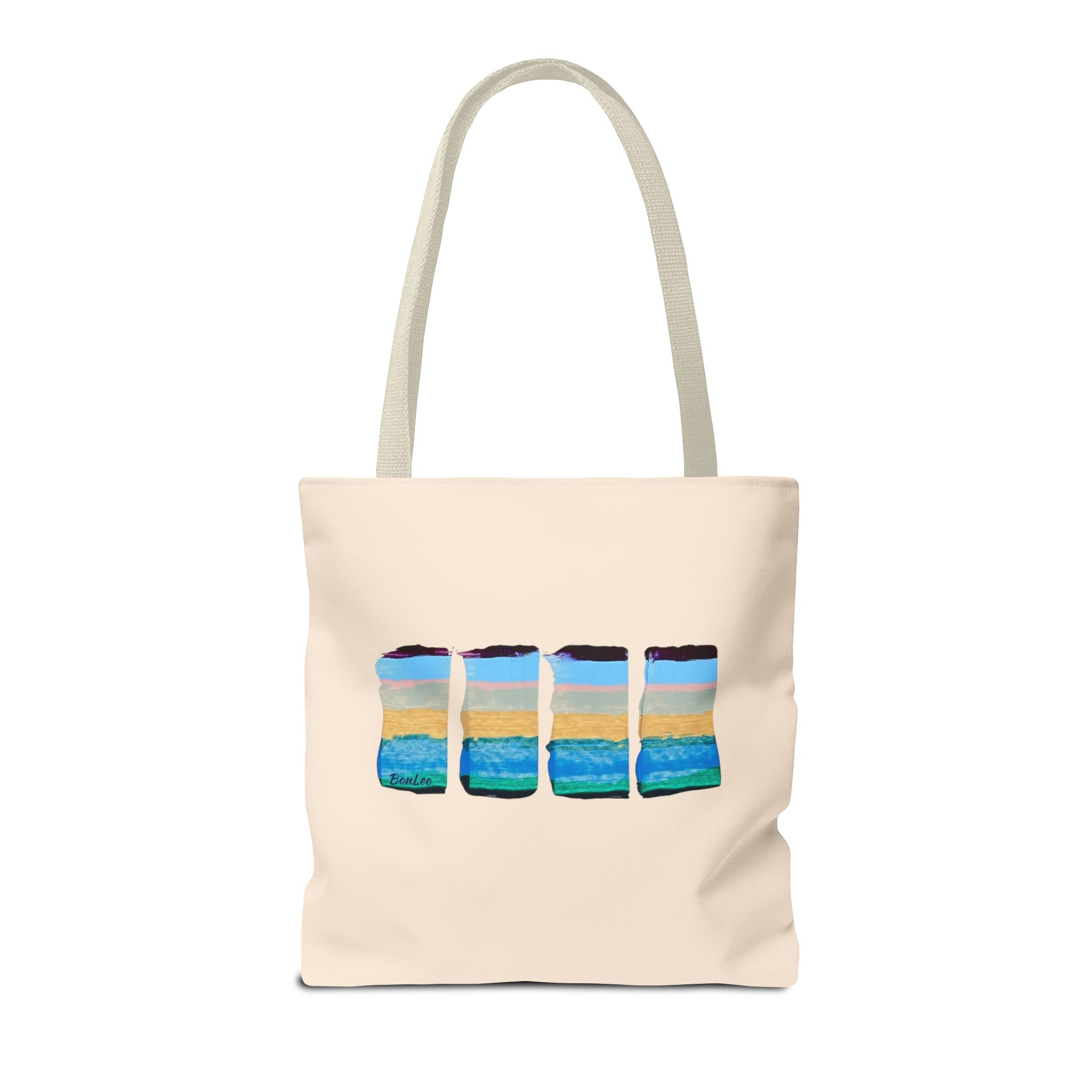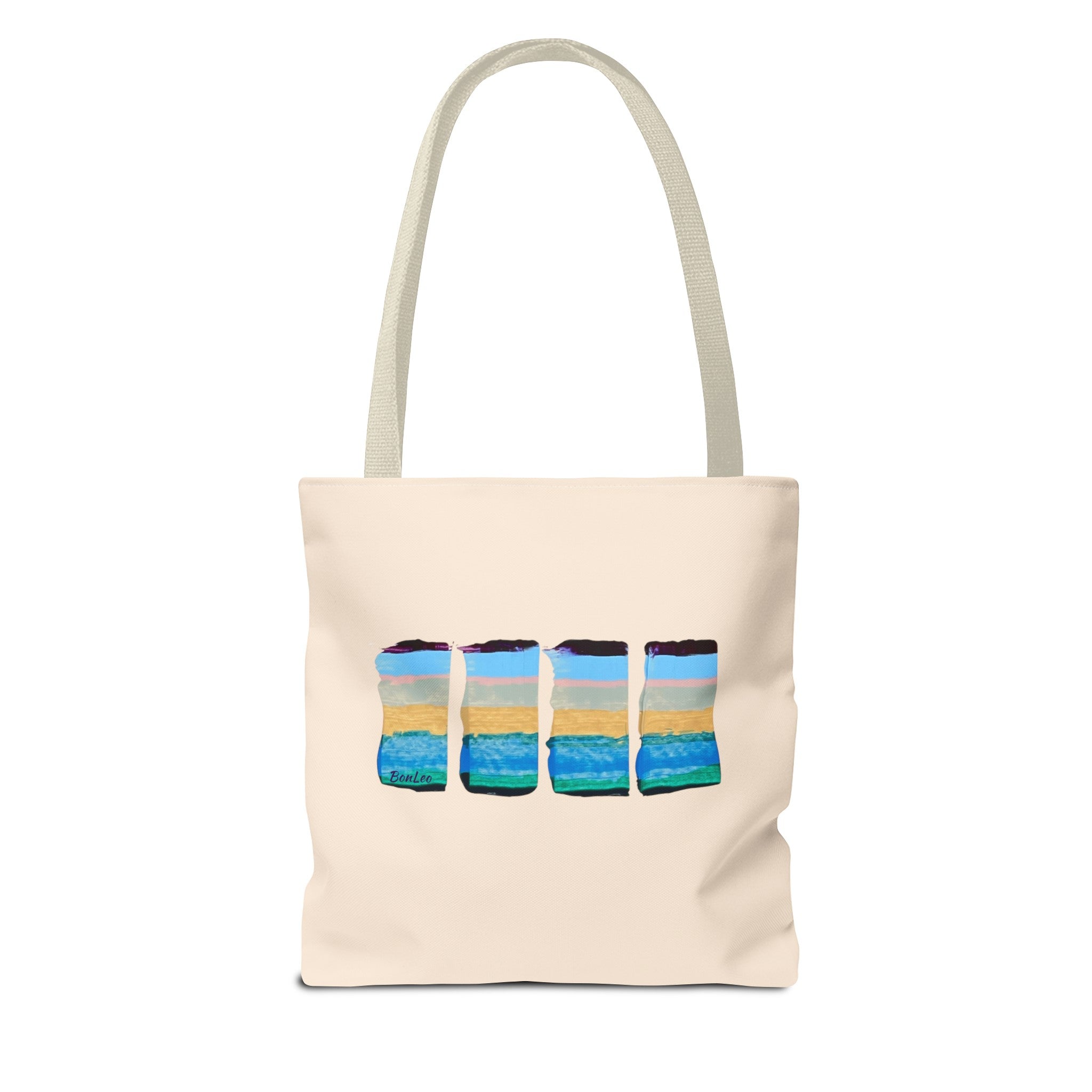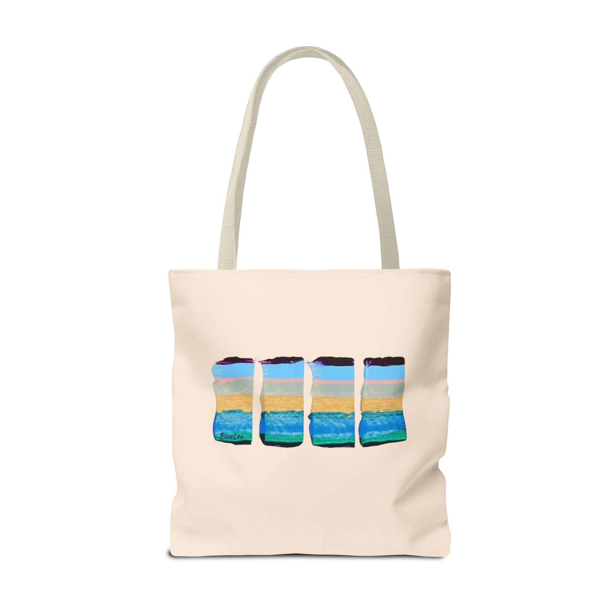 Ocean In Motion Beach Tote in Blue, Purple and Pink. A unique design painted in one continuous motion with palette knife and acrylics by Lenny Pinna.