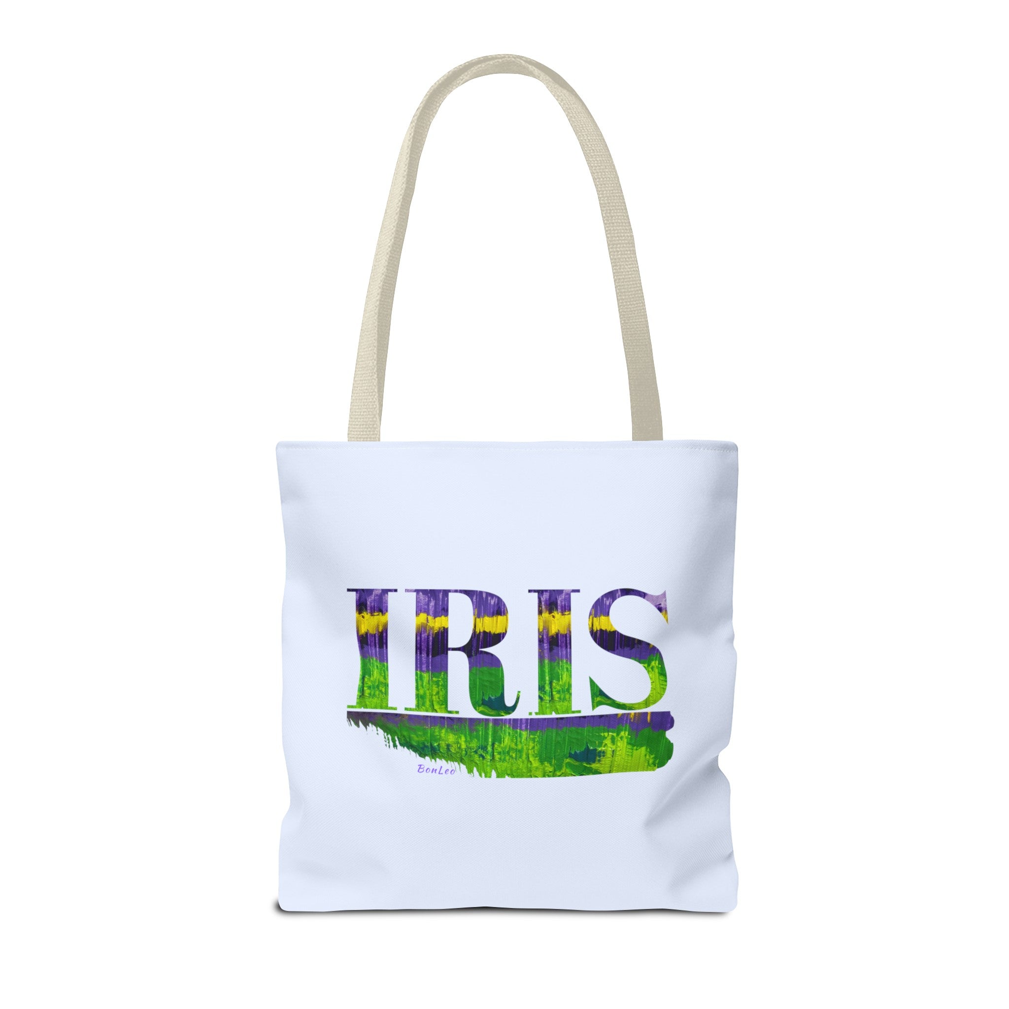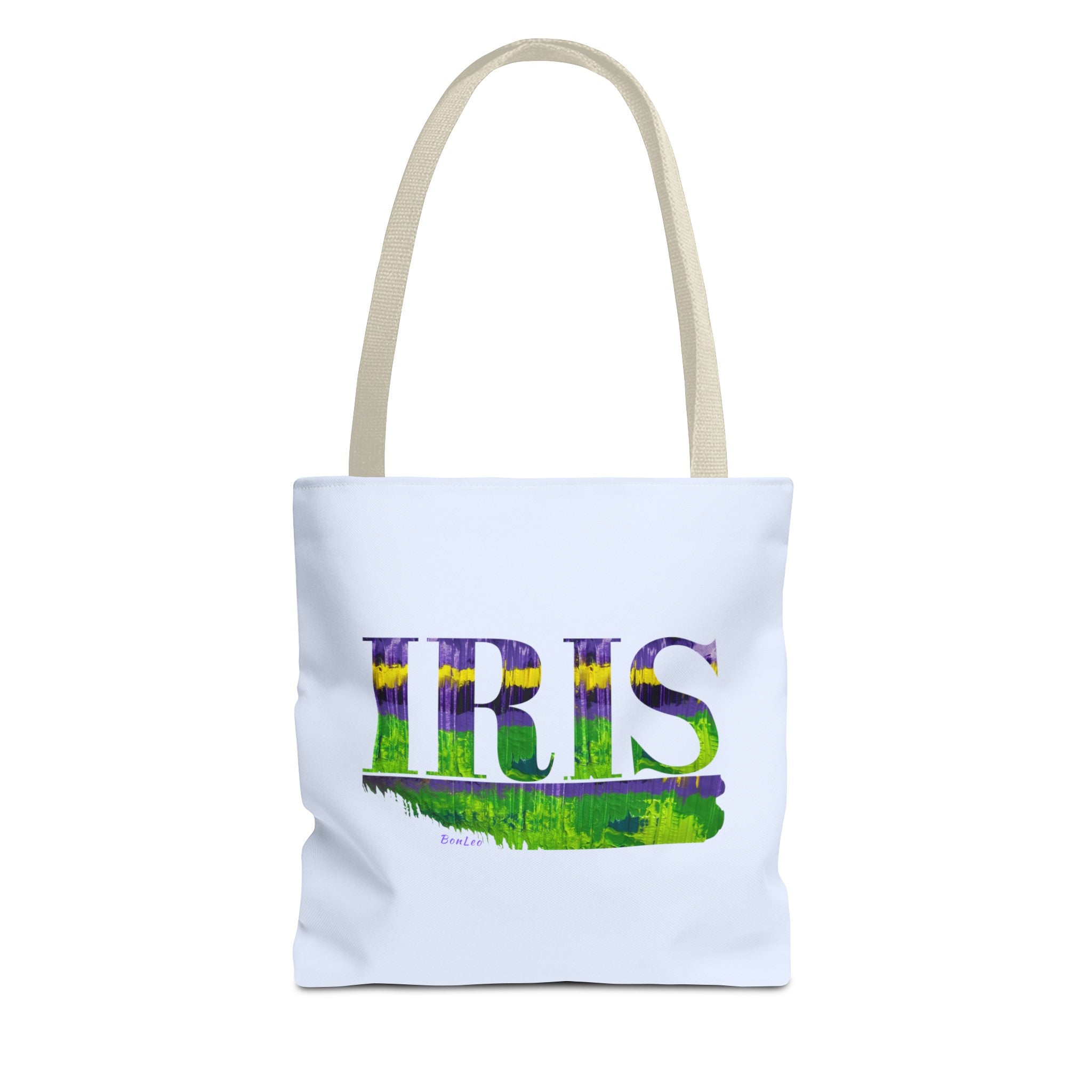 Iris Garden Tote In Purple and Green. A unique design painted in one continuous motion with palette knife and acrylics by Lenny Pinna.