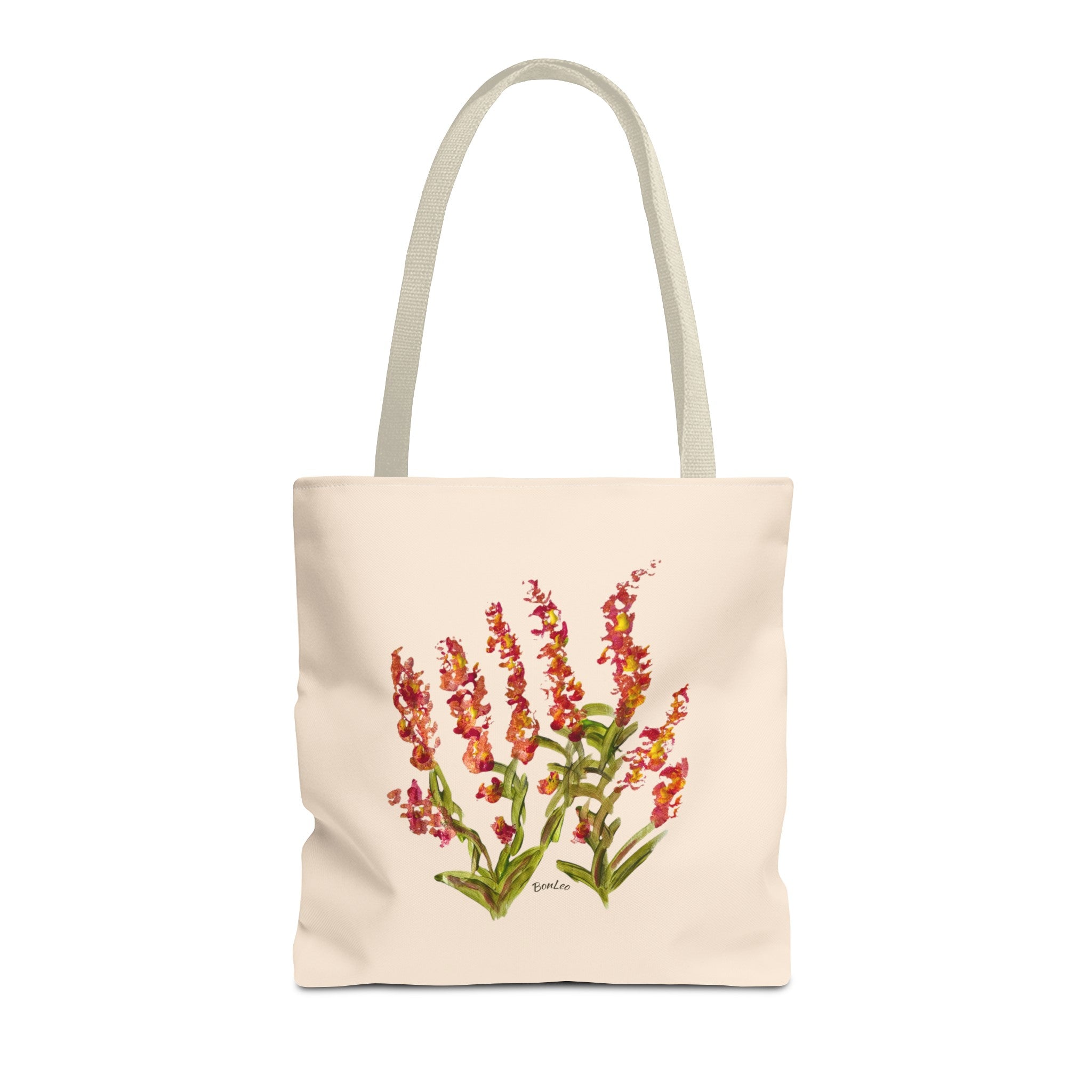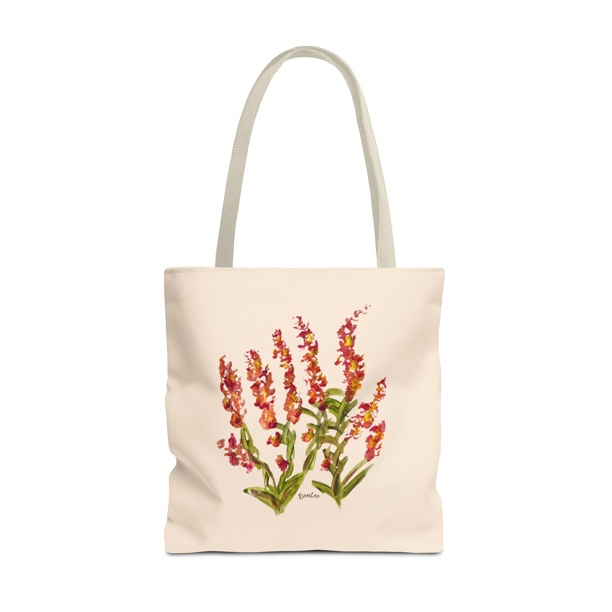 Whimsical Garden Tote Bag Orange Blooms. Painted with acrylics by Bonnie Diczhazy.